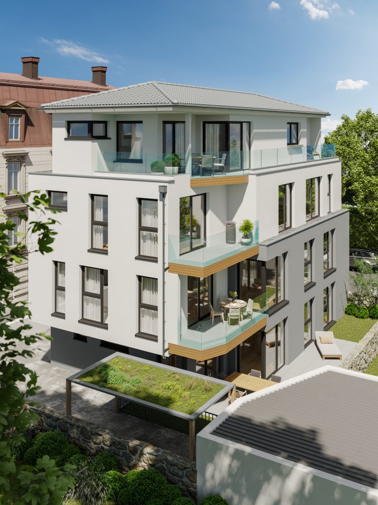 Architektonisch überzeugt das Gebäude durch klare Linien, großzügige Fensterflächen und eine harmonische Fassadengestaltung. Das oberste Geschoss wurde bewusst zurückgesetzt und mit einem Walmdach versehen – eine Referenz an die traditionelle Dachform der Altstadt, die hier auf moderne Weise neu interpretiert wird. Weitläufige Balkone und Terrassen erweitern den privaten Wohnraum ins Freie und bieten ein hohes Maß an Lebensqualität im städtischen Raum.